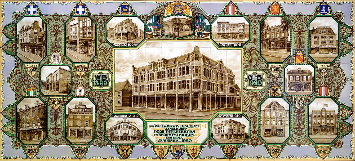 Zaandam, Zaans Museum. This year, the museum recieved a large tile panel concerning the Bischoff company of fashion stores. The company was established in 1895 by Wilhelm Bischoff ( 1871-1941). For the silver jubilee in 1920 the staff of the company donated the panel depicting the various stores with the opening years. Descendants of Wilhelm donated the panel which hung in the main office of the company in Zaandam. Zaans Museum, Schansend 7, 1509 AW Zaandam. Open daily: 10 - 17 hr.